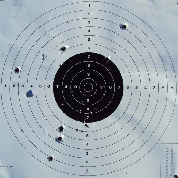 ciò che ora sappiamo è che con un arma così pesante e senza appoggio, utilizzando solo tacca di mira e mirino (microscopico visto dalladiotra) a 50mt. è un vero gioco alla roulette fare centro. Abbiamo scommesso un caffè a chi prendeva almeno il nero e alla fine il caffè è venuto freddo. Per chi invece vuole fare sul serio consigliamo l'uso di una diotra o ancora meglio (dove possibile) di un ottica e un morbido appoggio, in questo modo abbiamo avuto ottimi risultati.