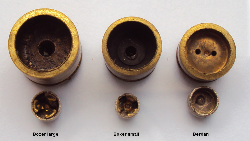 Abbiamo sempre cercato di far capire a tutti dove stà il giusto e dove è il vero, anche in questo caso qualcosa di vero c'è ma è ben lontano da ciò che si può credere. Partiamo dal fatto che bloccare la polvere vicino al foro di accensione ha poca utilità nel tiro classico con l'uso di munizioni per arma corta di capienza contenuta. Solitamente i bossoli capienti sono quei bossoli lunghi o molto larghi, come il .357M.; il .45Colt; il .44M.; .500 ecc. o quelli da carabina con diametri sostenuti che però in molti casi montano inneschi di tipo large, magari anche "magnum" quindi di magior potenza, che assolvono al loro lavoro riducendo il problema della polvere dispersa nel bossolo innondandolo all'atto dello sparo, di una vampa caldissima che così arriverà in ogni angolo innescando ogni granello di polvere. - Qui sopra una serie di inneschi, se pur può apparire strano il primo a sinistra è un innesco per bossolo da cannone (estratto da un bossolo sparato di uno Sherman della Seconda Guerra Mondiale calibro 75mm. A1M5) mentre i due inneschi al centro, riconoscibilissimi, sono i classici inneschi da noi usati per ricaricare le nostre munizioni, Large e Small pistol. Più a destra un innesco per bossoli per canna liscia; in questo caso per un cal. 12".