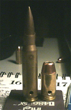 Prepariamo il trapano montando la punta, quando pronti iniziamo a forare il bossolo della cartuccia a circa 8mm. dal fondello per una .45HP (quella nella foto) o un .308W., 5mm. per un 9X21 o .38Sp. La distanza dal fondello deve essere adeguata al bossolo perchè esso è pieno nella parte inferiore, quella vicina all'innesco, forando troppo bassi non si avrebbero gli effetti sperati anzi, bisogna evitare che la punta del trapano ruotando colpisca l'innesco se questo è presente provocando cosi la sua detonazione con conseguente pericolo di distacco del proiettile e di getto incandescente dal foro appena fatto. Nella figura a destra indico come misurarla, naturalmente evitate di forare nella parte indicata in rosso.